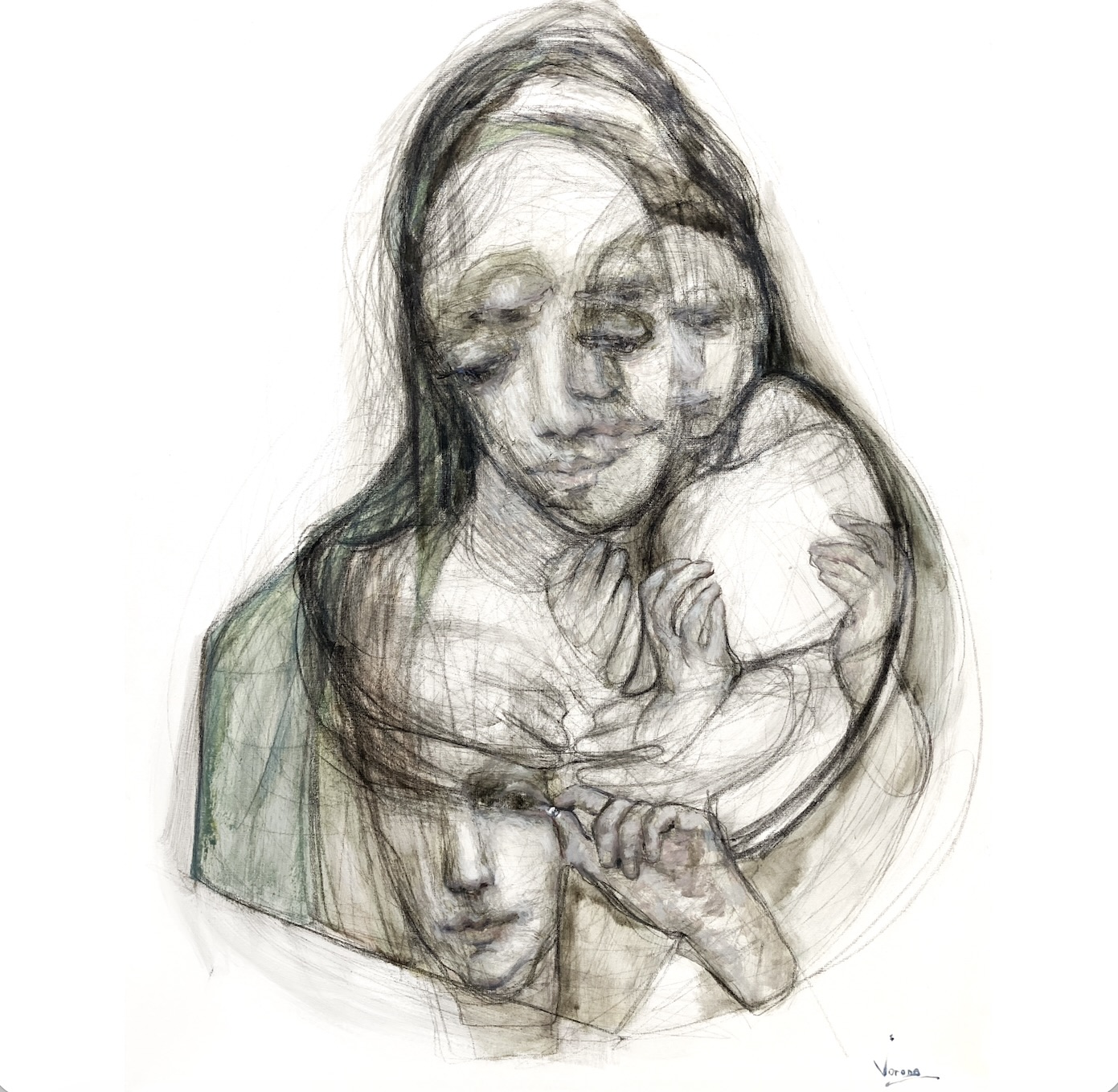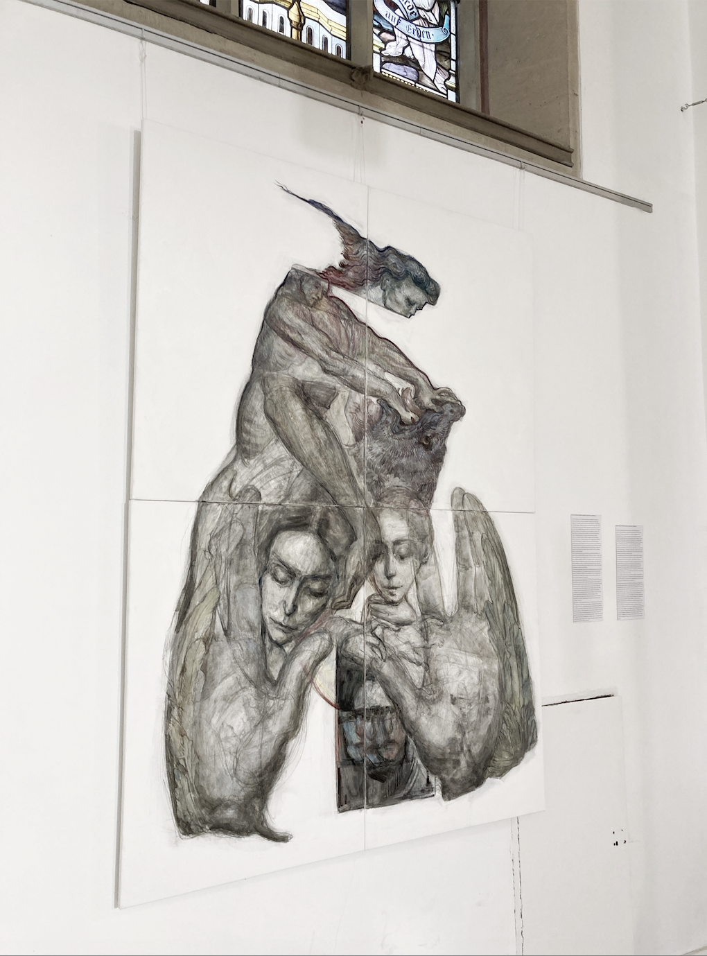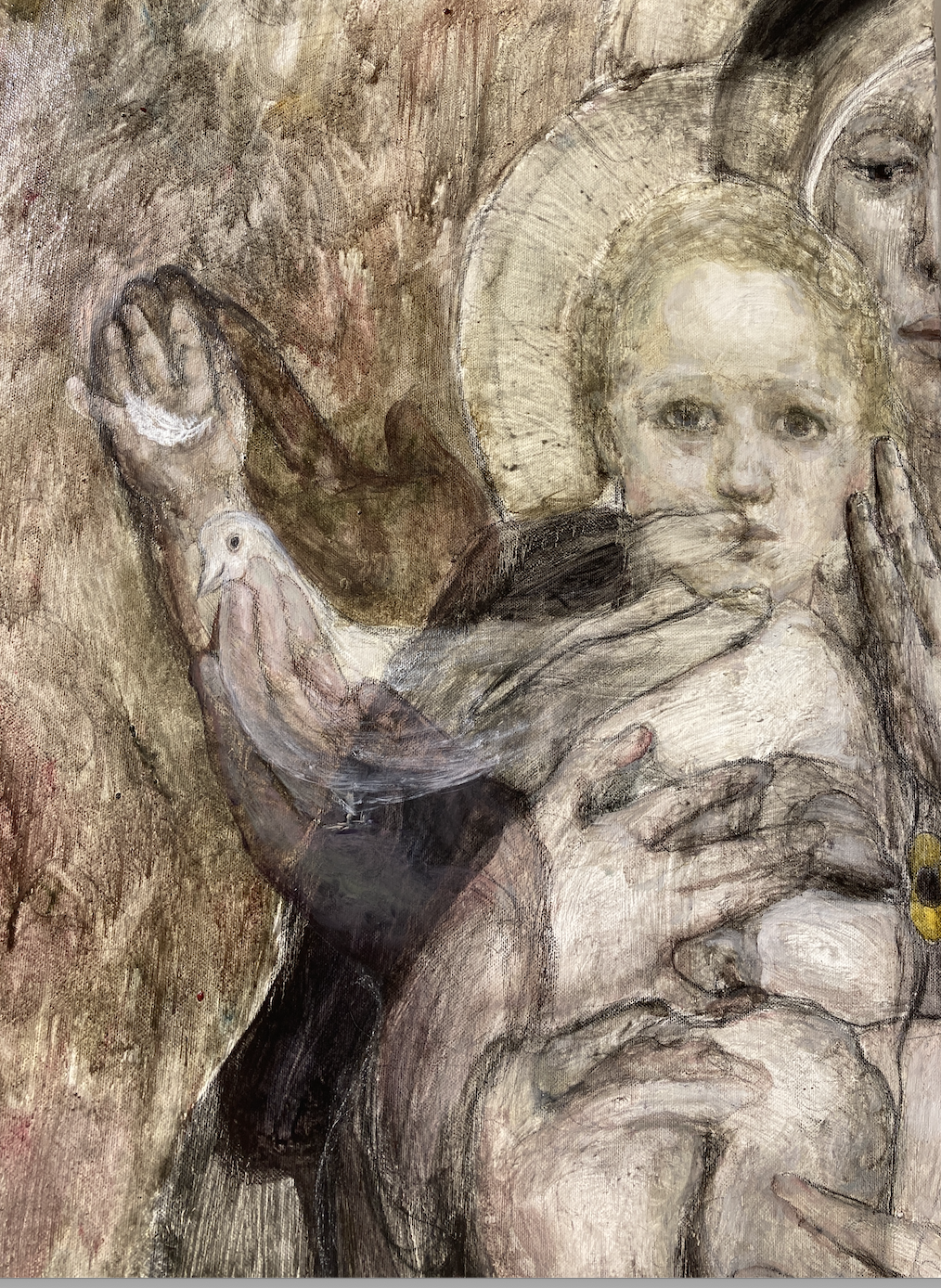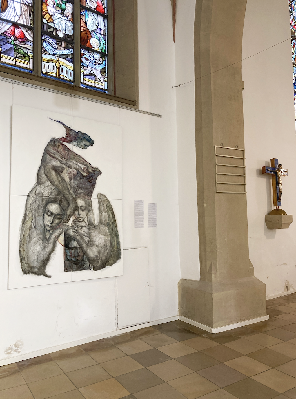 Mein Projekt, das dank der Initiative von Pfarrer Jakob Timmermann nächstes Jahr in der Kirche St. Michaelis vorgestellt wird, ist eine Dokumentationdes Weges des Überlebens, des täglichen Kampfes des Herzens und des Verstandes und des täglichen Sieges des Lichtes über die Dunkelheit. Die neuen Werke und Texte, an denen ich arbeite, sind eine Suche nach einem Funken des Guten in den Augen eines jeden von uns. Ich schreibe über mein Leben in Deutschland, über Freundschaft, Unterstützung und Verständnis. Meine Bilder sind sowohl Selbstporträts als auch Porträts all der Menschen, denen ich begegne. Es sind kollektive Bilder, auf denen man keine einzelne Figur sehen kann, man kann nicht verstehen, wessen Hände zu wem gehören, weil es ein einziges Ganzes ist, eine Person, die Teil einer Gemeinde ist. Das ist Empathie und Unterstützung, gegenseitiger Respekt und Verständnis, das ist die Einheit, die Kraft gibt, der Dunkelheit zu widerstehen.
