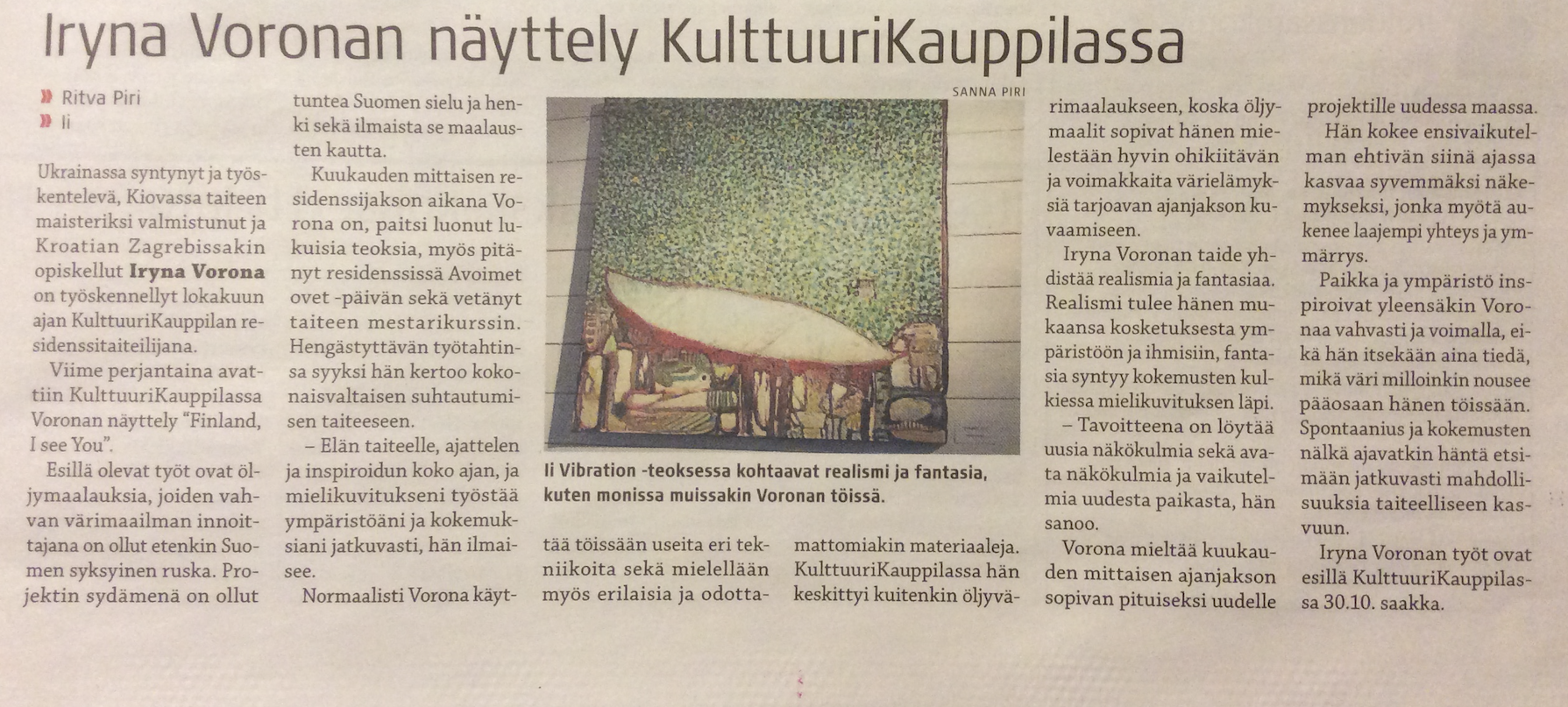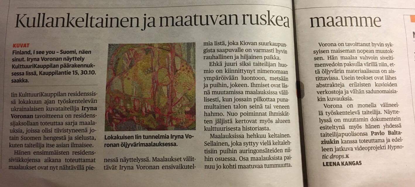 Während ihres Aufenthalts schuf Iryna Vorona eine neue Serie impressionistischer Werke für die Ausstellung „KulttuuriKauppila – Finnland – Ich sehe dich, Finnland – näen sinut“. Die Idee der Ausstellung bestand darin, die Seele und den Geist Finnlands anhand von Materialien und Farben zu erforschen. Auf der Ausstellung wurde auch die Videoinstallation von Voronas Ehemann, Pavlo Baltaziuk, „Hypnotischer Tropfen“ präsentiert. Das Werk war Teil des Projekts „Zeitgefühl“, das während ihres Aufenthalts im Kunstnarhuset Messen in Norwegen von Dezember 2017 bis Januar 2018 lief. Während ihres Aufenthalts organisierte Vorona zudem einen Workshop zum impressionistischen psychologischen Selbstporträt im KulttuuriKauppila.