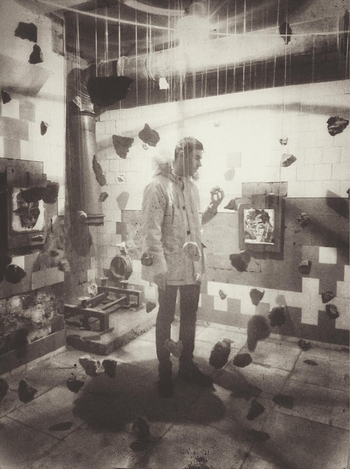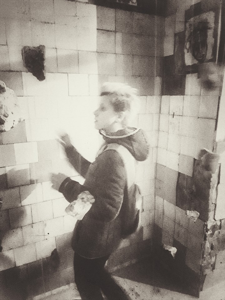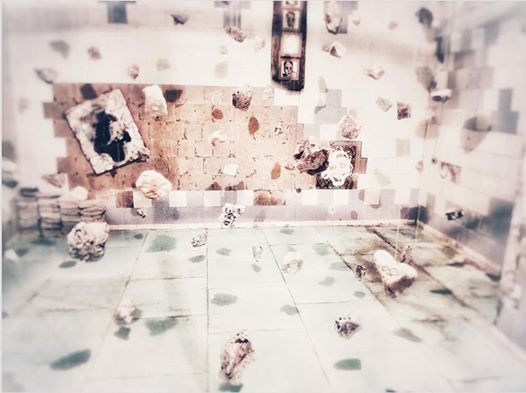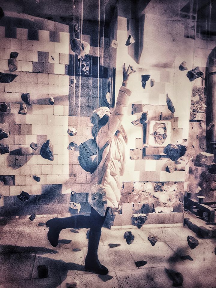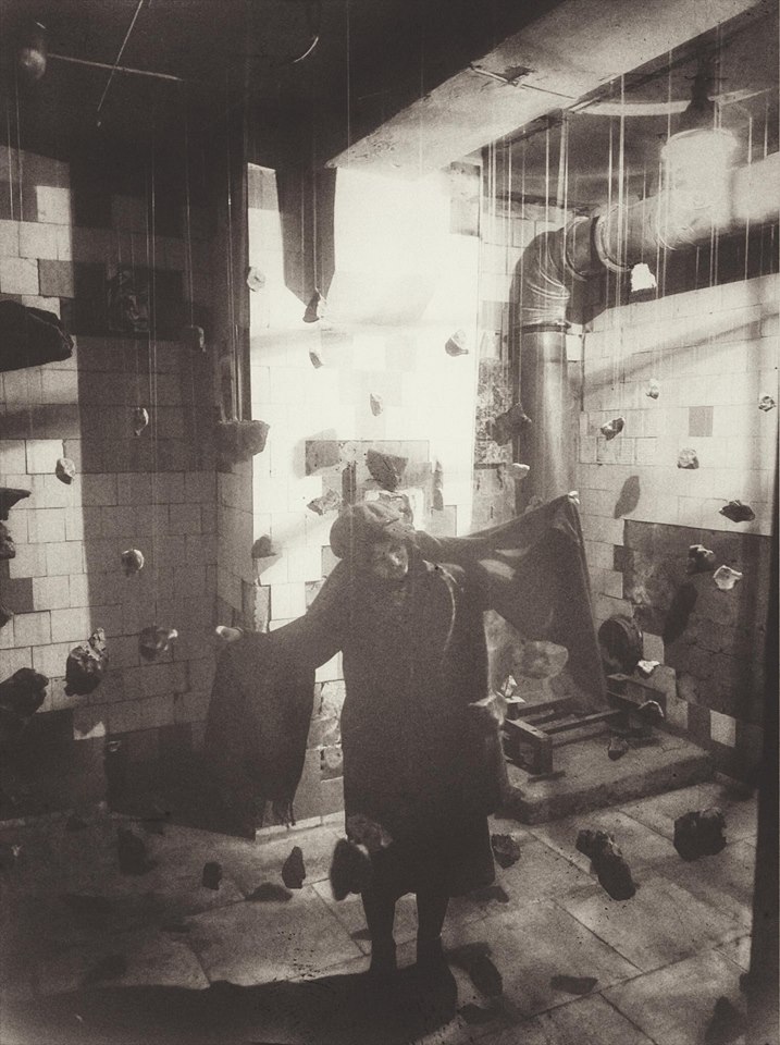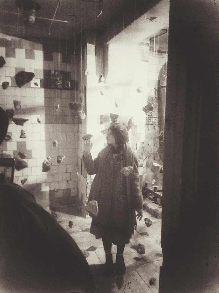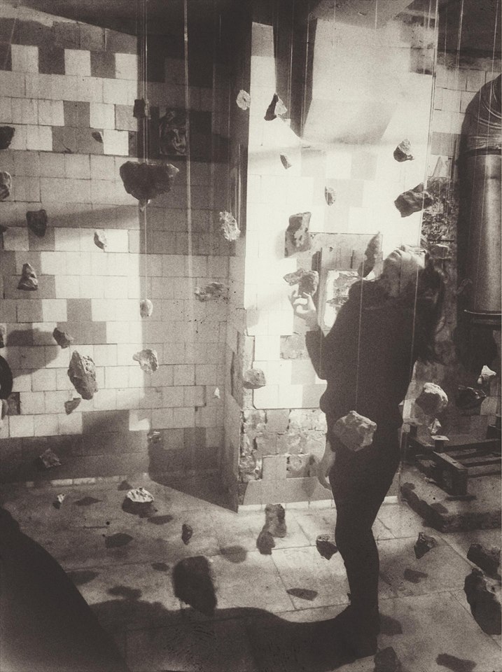 …wo Iryna Vorona inmitten eines Raumes mit abgeblätterten Fliesen einen meditativen Sinn in den hängenden Steinen sucht…