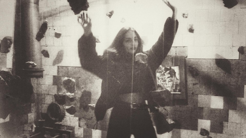 „Inmitten eines Raumes mit abblätternden Fliesen steht die junge Künstlerin Irina Vorona und sucht nach einem meditativen Sinn, während sie zwischen den an Seilen hängenden Steinen hindurchgeht. Ihre Installation trägt den Titel „Individual vs Society“ – die Steine bewegen sich chaotisch, und es ist nicht einfach, einen Weg zwischen ihren Bahnen zu finden.