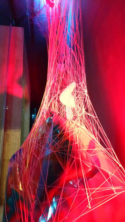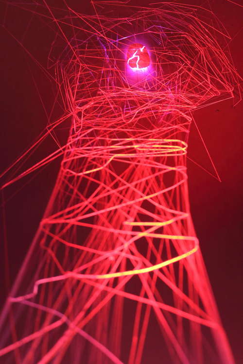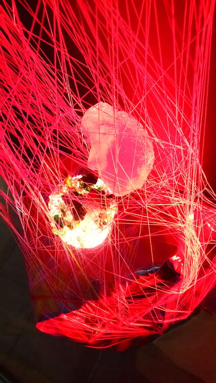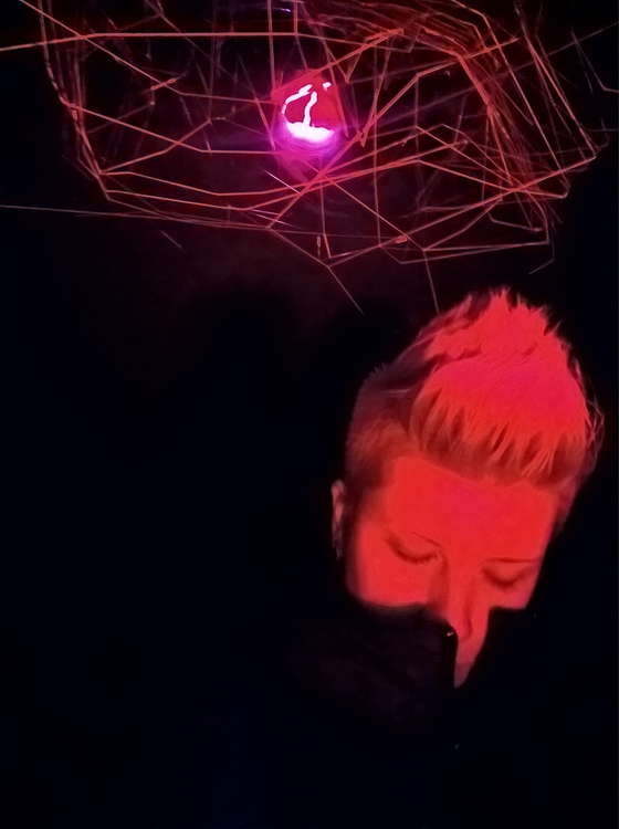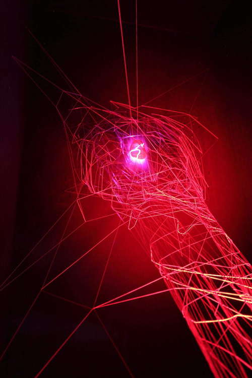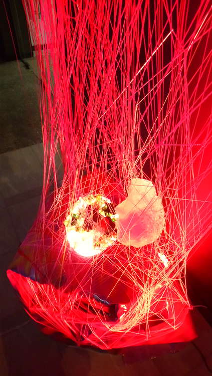 Die Installation „Inneres Licht“ besteht aus zwei Teilen – der Visualisierung äußerer und innerer Energie. Der Mensch ist durch einen Faden mit dem Lichtelement verbunden, das das innere Licht symbolisiert.