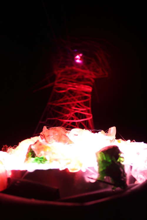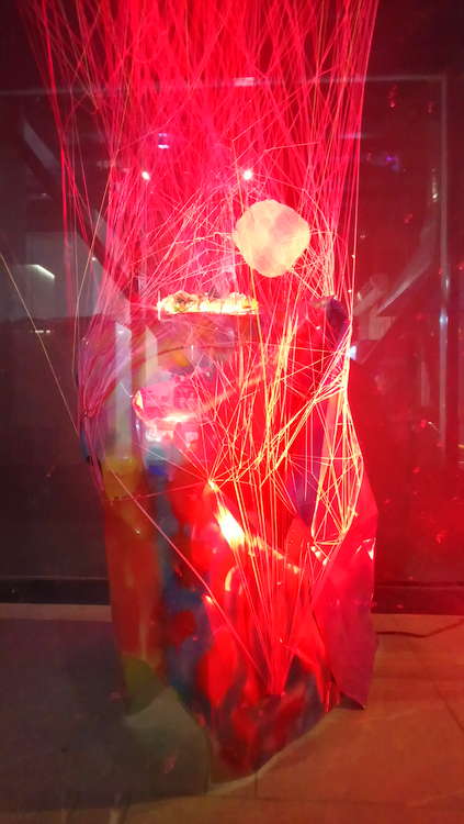 – Lichtelement. Größe: H 140 cm, D 80 cm. Materialien: Metall, geschmolzenes Glas, LED-Band, Acryl.